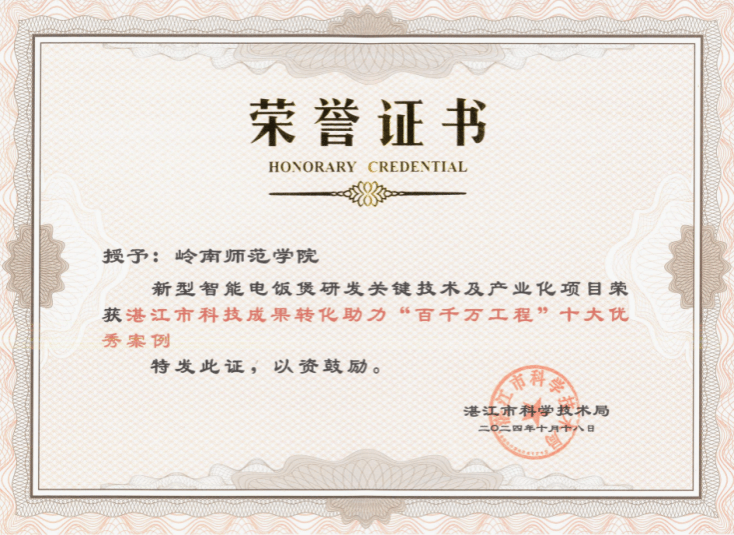 2024年10月18日,湛江市科技成果转化助力“百千万工程”优秀案例评选活动暨“湛江市十大科技成果转化优秀案例”发布,十大科技成果涵盖了工程制造、绿色环保和海洋牧场等多个领域。其中,我校陈波教授团队研发的成果“新型智能电饭煲研发关键技术及产业化”上榜。
