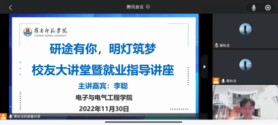 为调动学生考研的积极性,切实为正在备考的同学指明方向,扎实推进学风建设,营造浓厚的学习氛围,11月30日,电子与电气工程学院举办召开校友大讲堂暨就业指导讲座。2018级电气工程及其自动化专业校友李聪,辅导员黄秋洁,学院考研学生参会。
