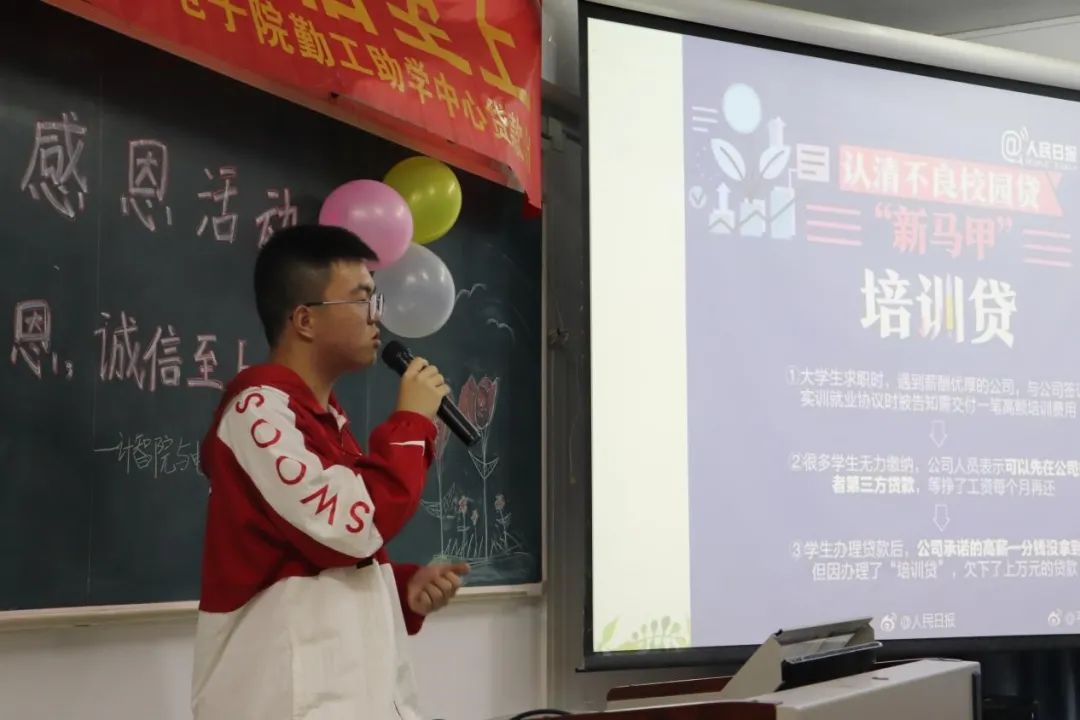 活动进行时,第一个重要环节是莫镇宇同学对不良校园贷以视频和PPT形式进行讲解。他通过生动贴切的图片与视频形式,为同学们区分了不良校园贷和正规贷款,并列举了形形色色的不良贷款套路形式,指出当代大学生容易受到不良校园贷诱惑的多种原因,提高了同学们对陷阱的认识和警惕。