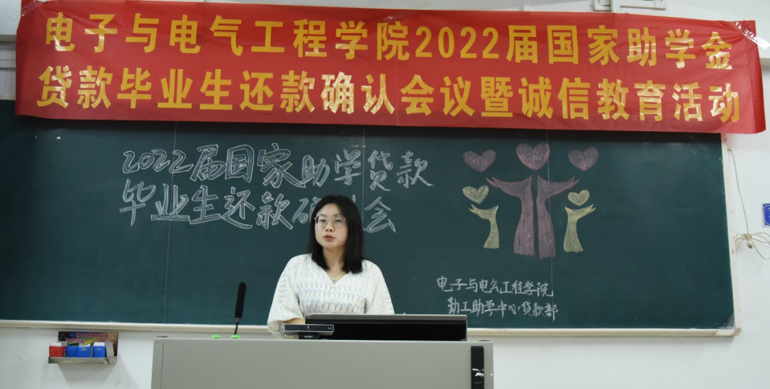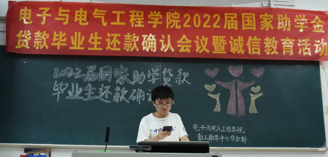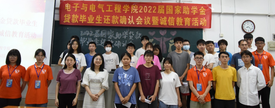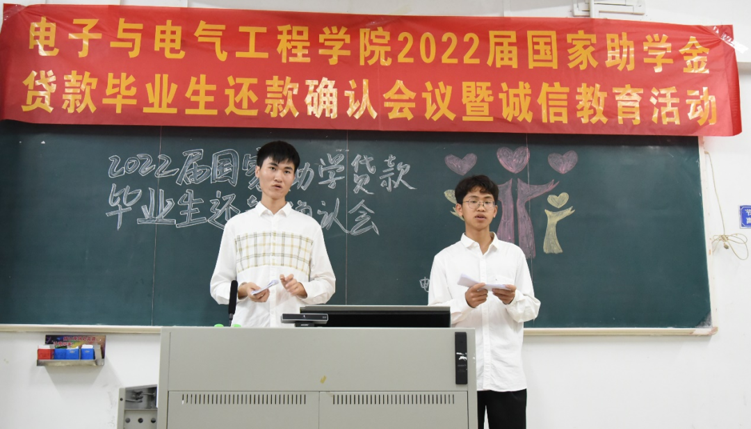4月25日晚,电子与电气工程学院勤工助学中心于在弘雷楼202室举行2022届国家助学金贷款毕业生还款确认会议暨诚信教育活动。学院资助工作指导老师黄秋洁、自强社干部颜章杰及所有贷款生出席会议。会议由卢俊成,杨浩威主持。