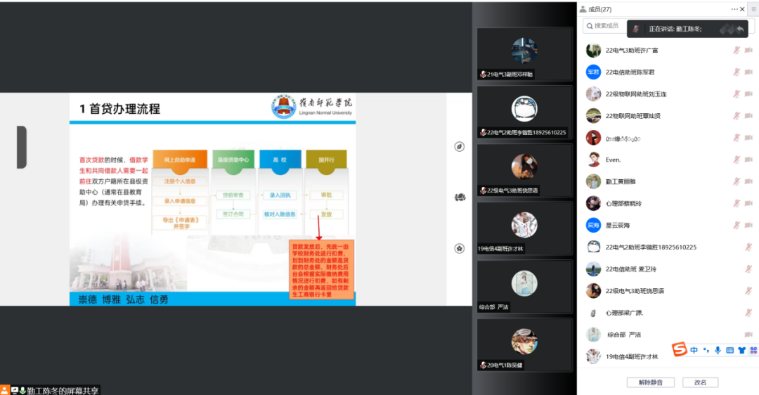 为宣传学生资助相关政策,提升学院学生资助工作队伍素质能力,8月20日,电子与电气工程学院召开2022年秋季学期学生资助工作培训会,2022级新生助班、全体副班、院勤工服务中心工作人员通过腾讯会议参加了培训。